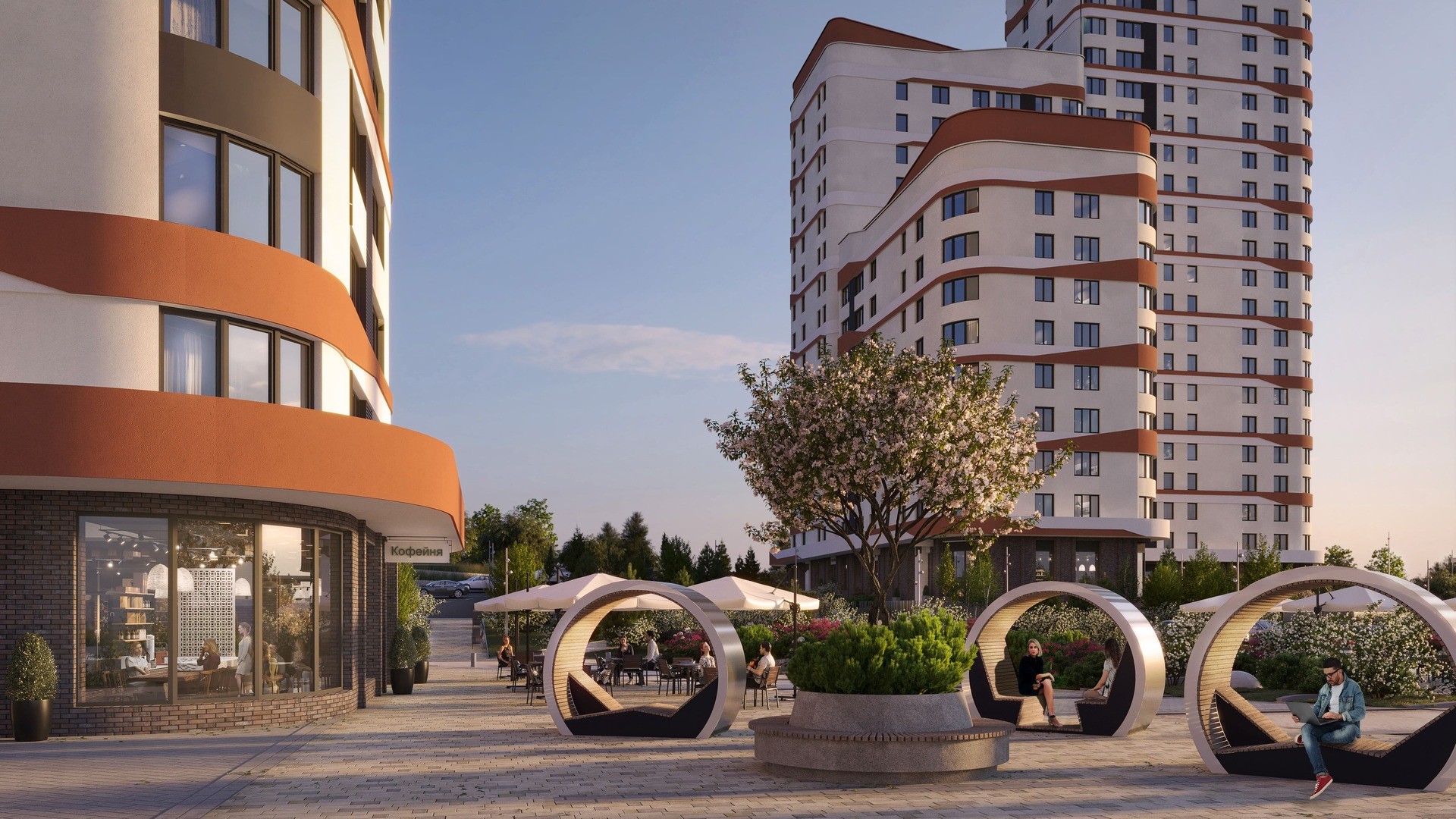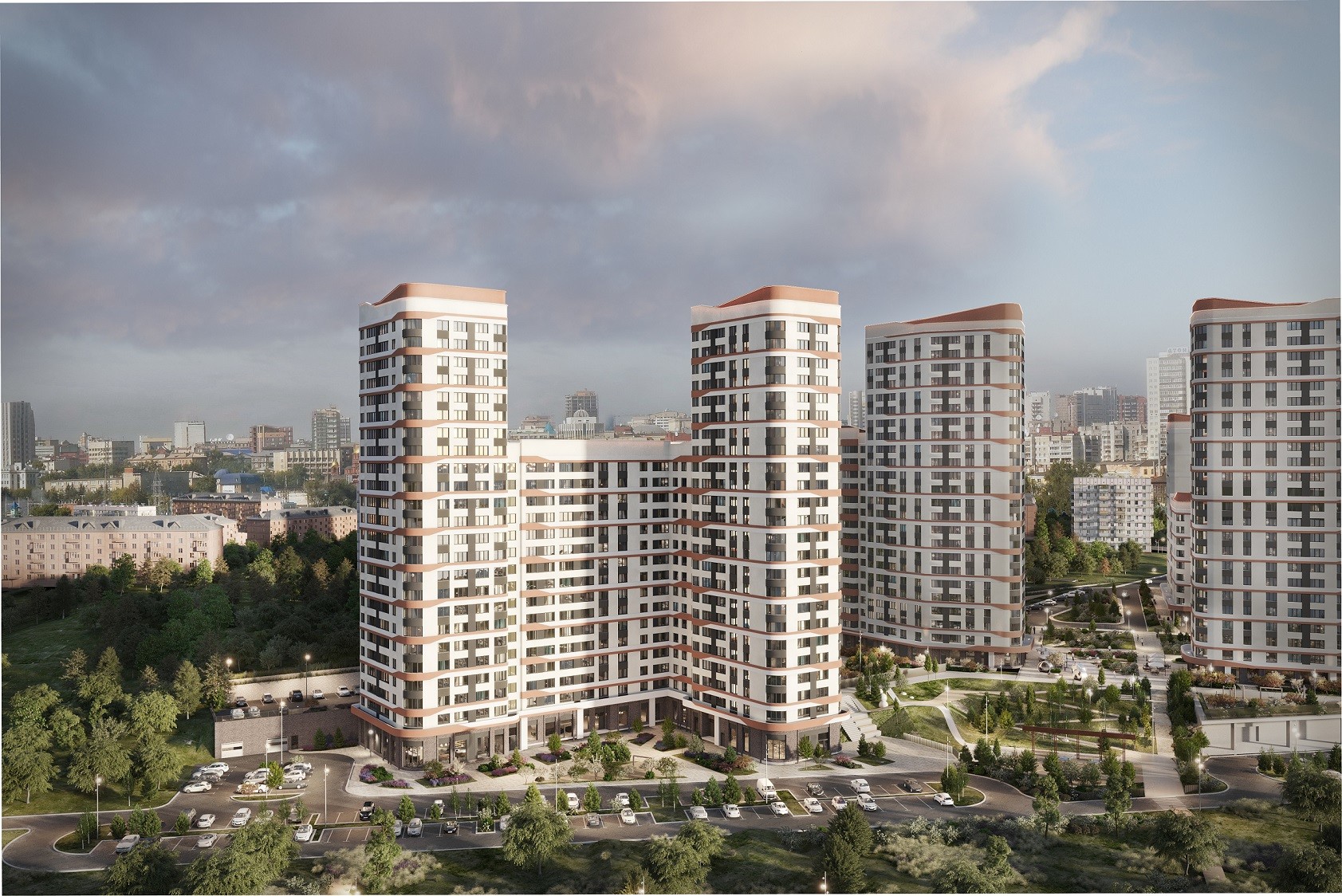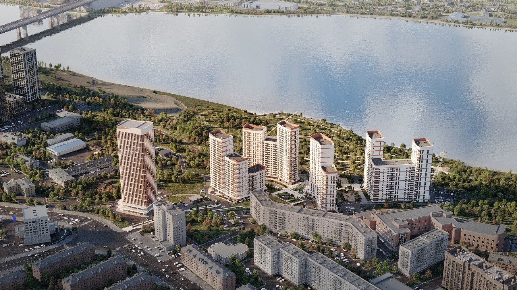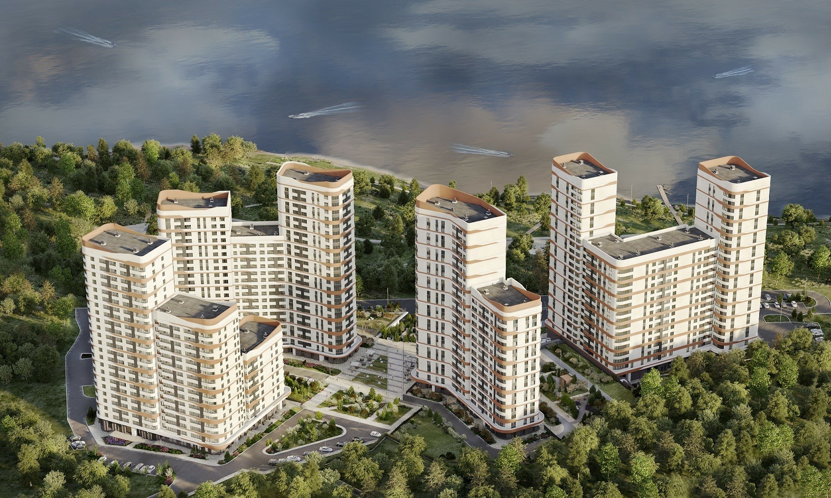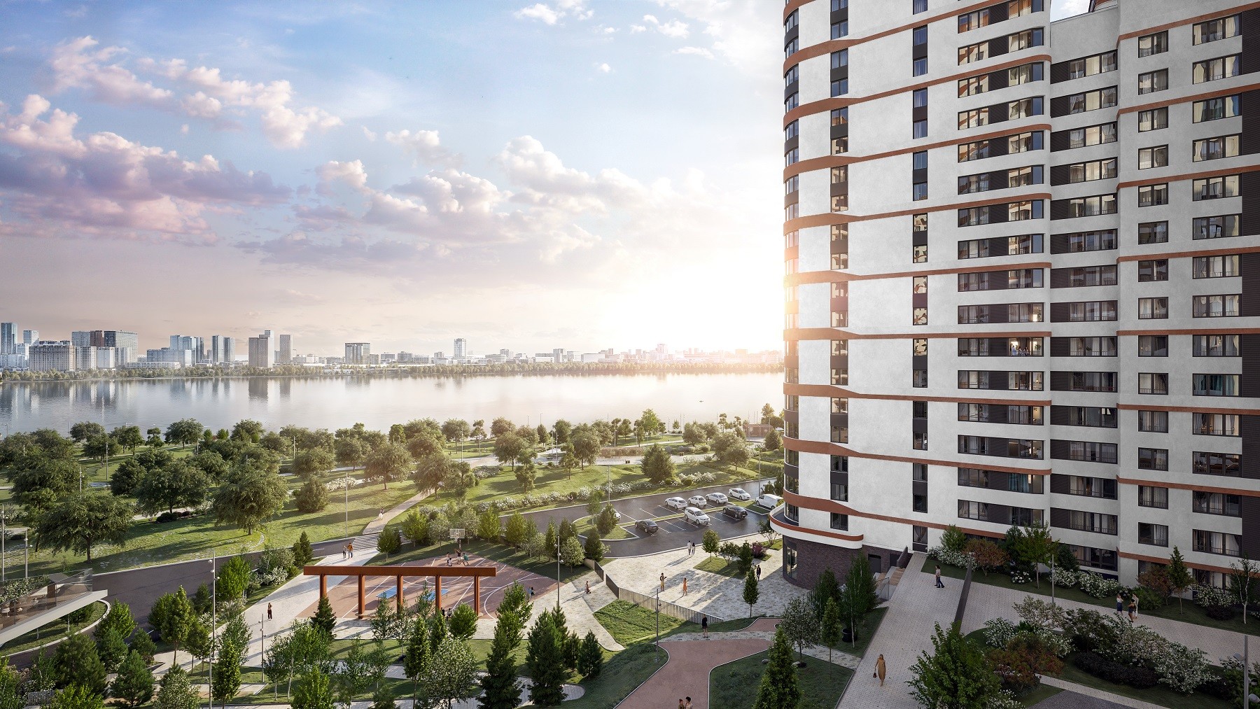 Переменная высотность зданий обеспечивает вид на реку для максимального количества квартир: любуйтесь закатами прямо из своей квартиры.